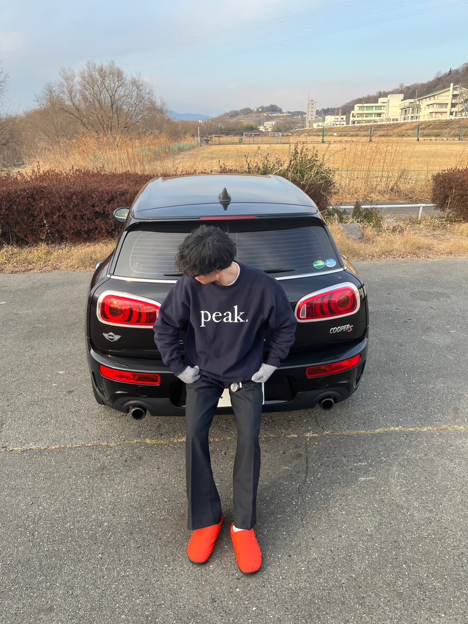 色の濃いネイビーの生地と相性の良い、peak.の白ロゴを入れたシンプルなスウェットです。